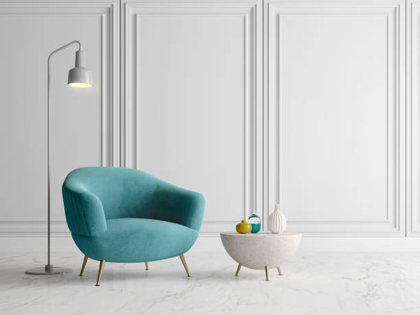 Tyrkysové kreslo s oblými tvarmi a zlatými nohami pre farebné akcenty.